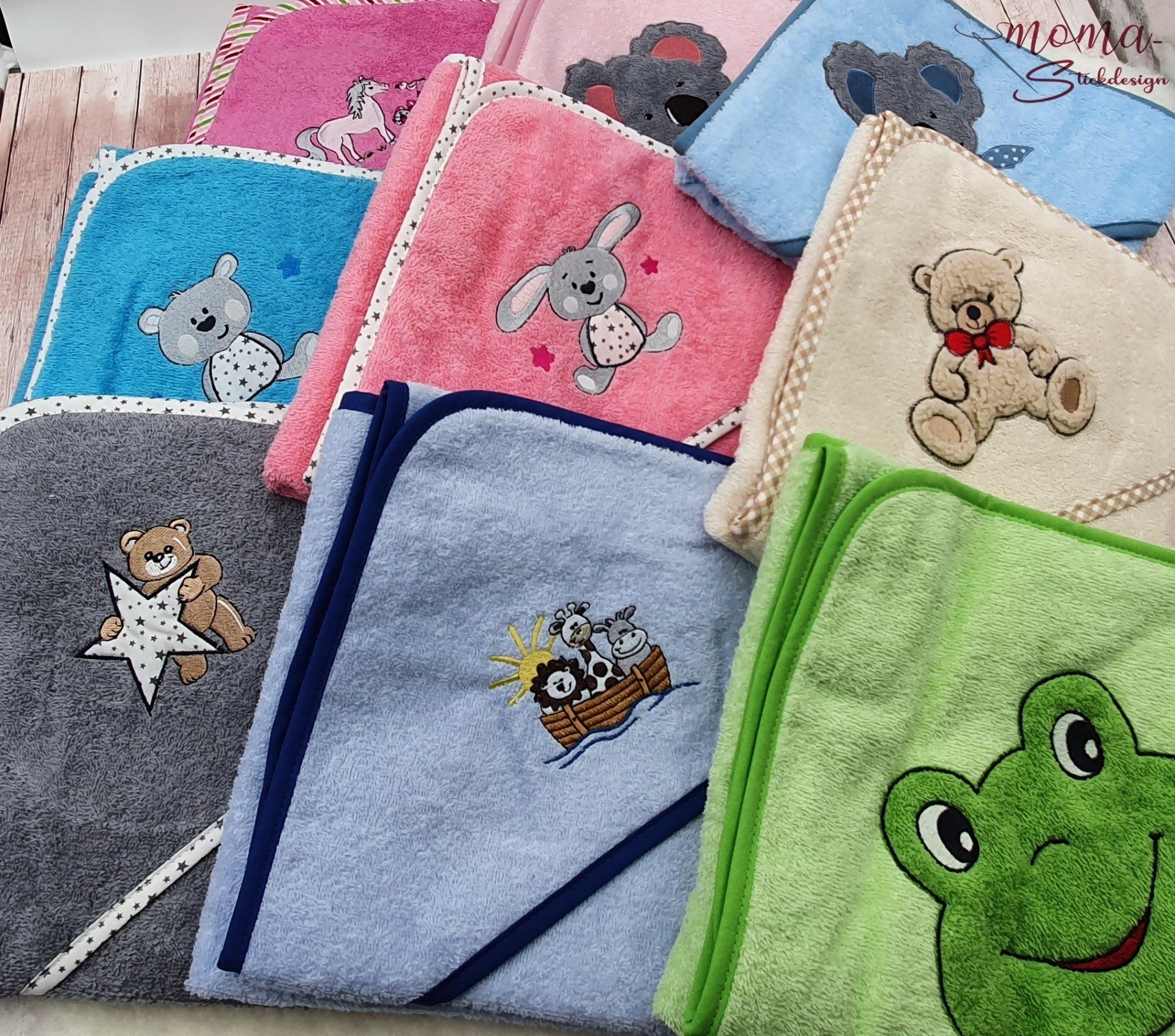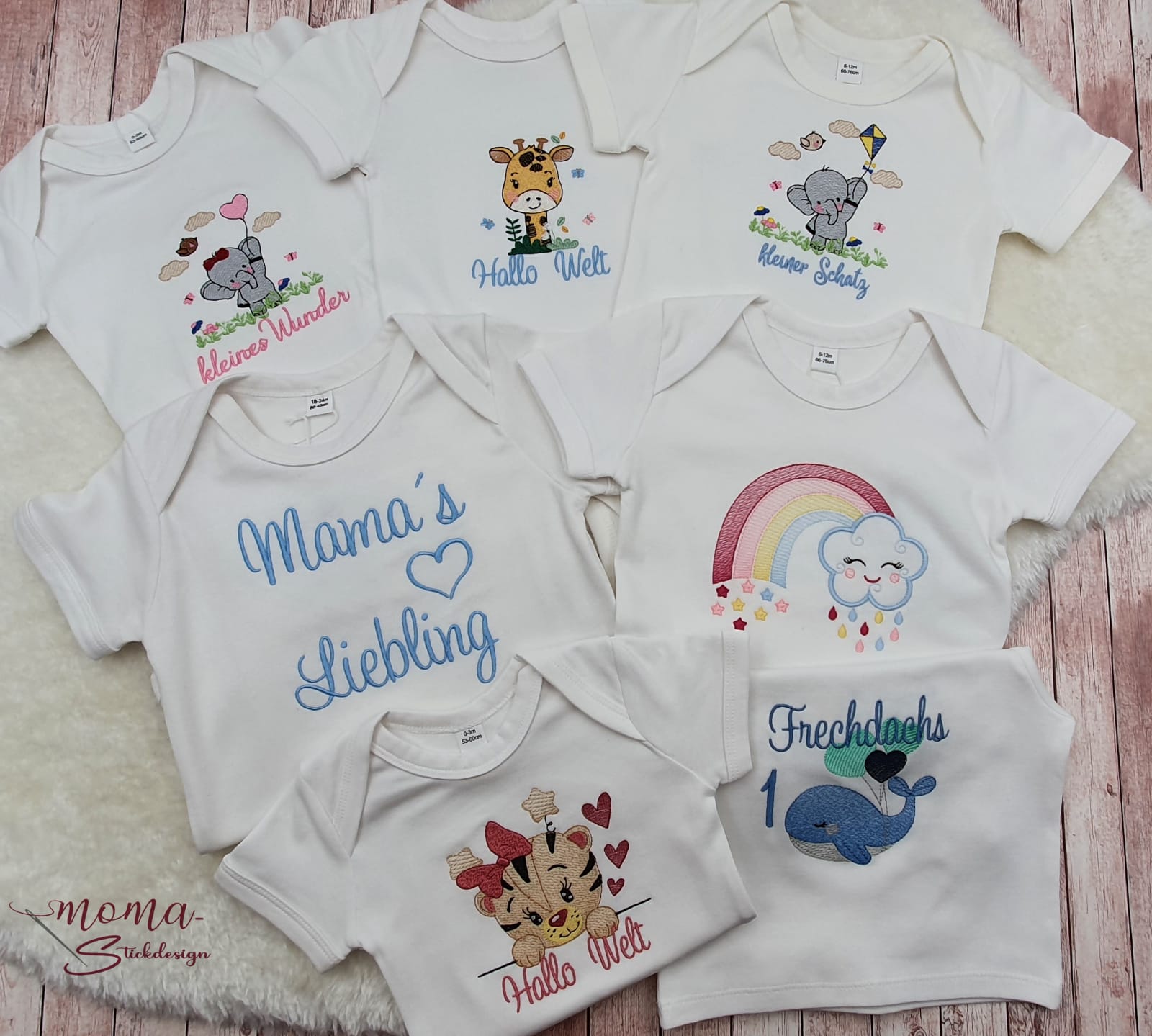 Hochwertige T-Shirts, Baby Bodys, Baby Lätzchen, Riesen Latz, Kapuzenhandtücher und Lederpuschen werden liebevoll mit süßen Motiven, zum Teil personalisiert mit Namen und Zahl auf Profistickmaschinen bestickt.