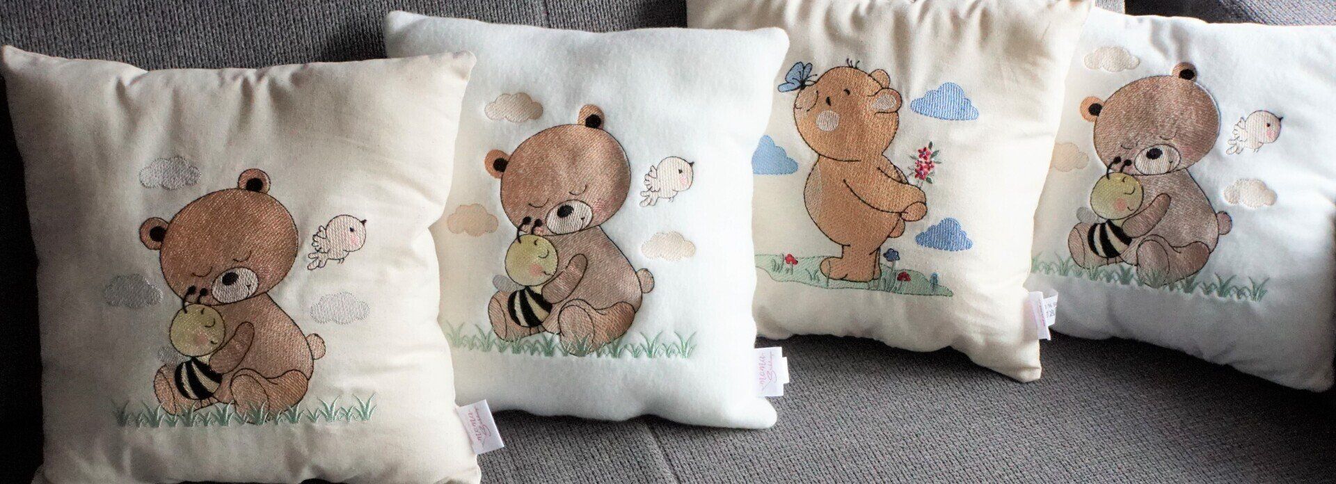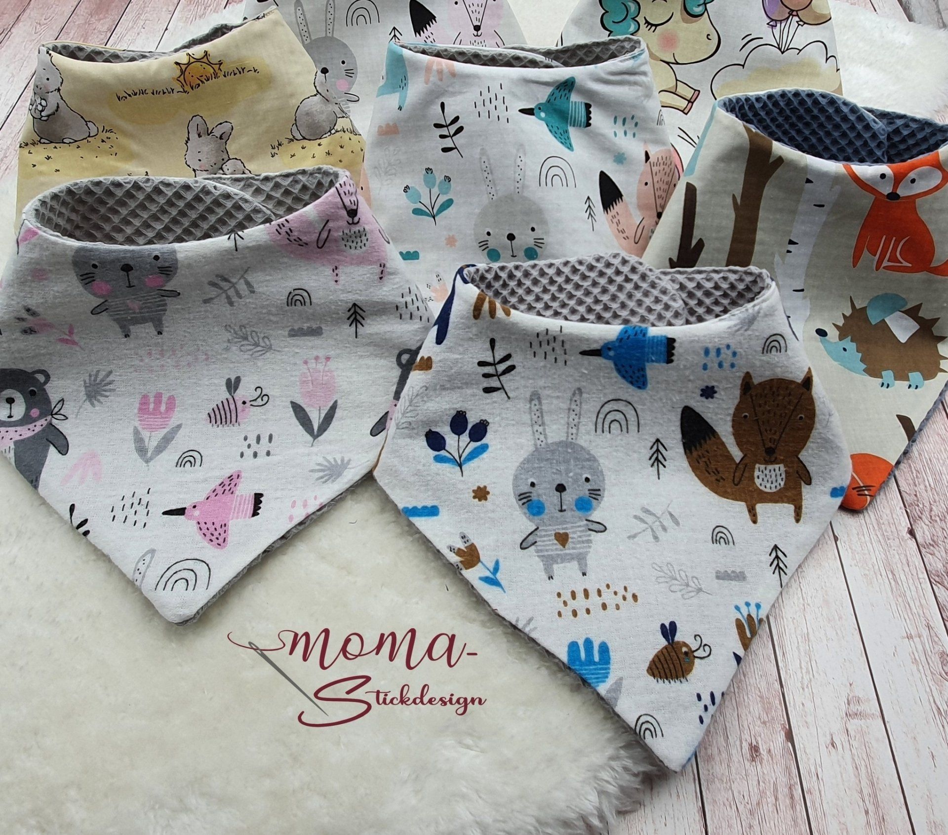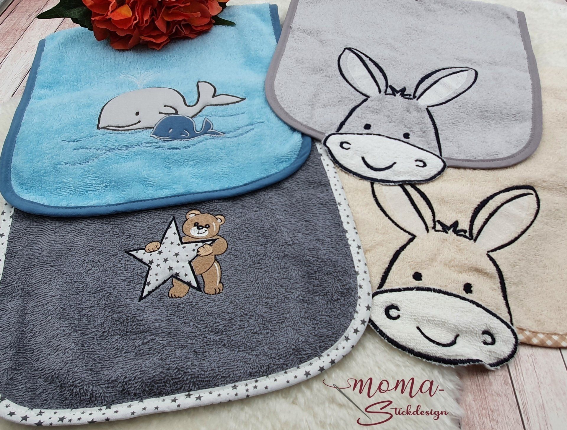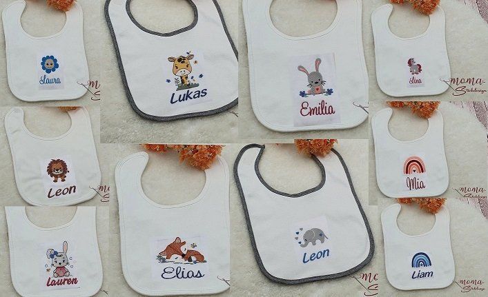 Hochwertige T-Shirts, Baby Bodys, Baby Lätzchen, Riesen Latz, Kapuzenhandtücher und Lederpuschen werden liebevoll mit süßen Motiven, zum Teil personalisiert mit Namen und Zahl auf Profistickmaschinen bestickt.